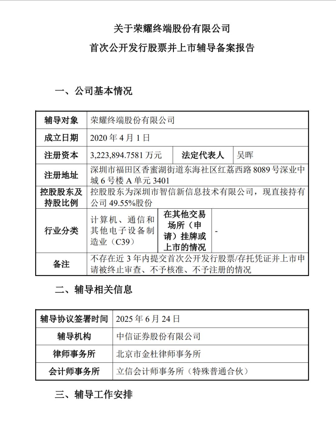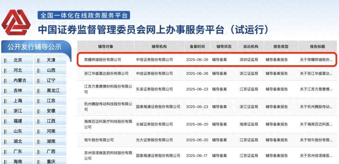 根據(jù)備案報告信息,榮耀上市輔導(dǎo)機(jī)構(gòu)為中信證券,輔導(dǎo)工作預(yù)計從2025年6月至9月進(jìn)行到2026年1月至3月。