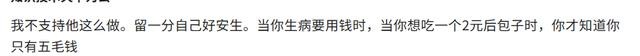 有人發愁:“我不支持他這么做。留一份自己好安生,當你生病要用錢時,當你想吃一個2元包子時,你才知道你只有五毛錢。”
