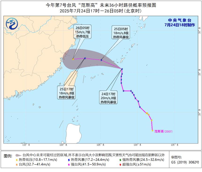 今年第7號臺風“范斯高”未來36小時路徑概率預報圖。據中央氣象臺。