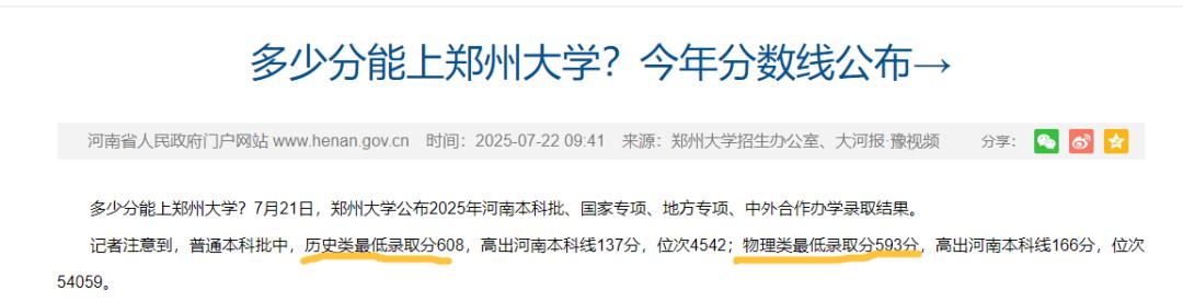 河南省人民政府網站的數據顯示,今年考上鄭州大學的河南考生,歷史類最低分608,物理類最低分593。