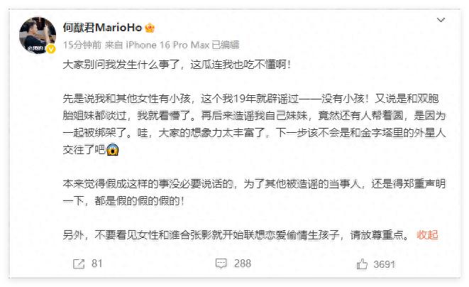 賭王之子何猷君被曝有私生子,甚至還有人傳他和妹妹之間的關(guān)系不純。對(duì)此,何猷君發(fā)文辟謠,表示和其他女性沒有小孩,和妹妹的傳聞更是謠言。“大家的想象力太豐富了,下一步該不會(huì)是和金字塔里的外星人交往了吧。”何猷君寫道。