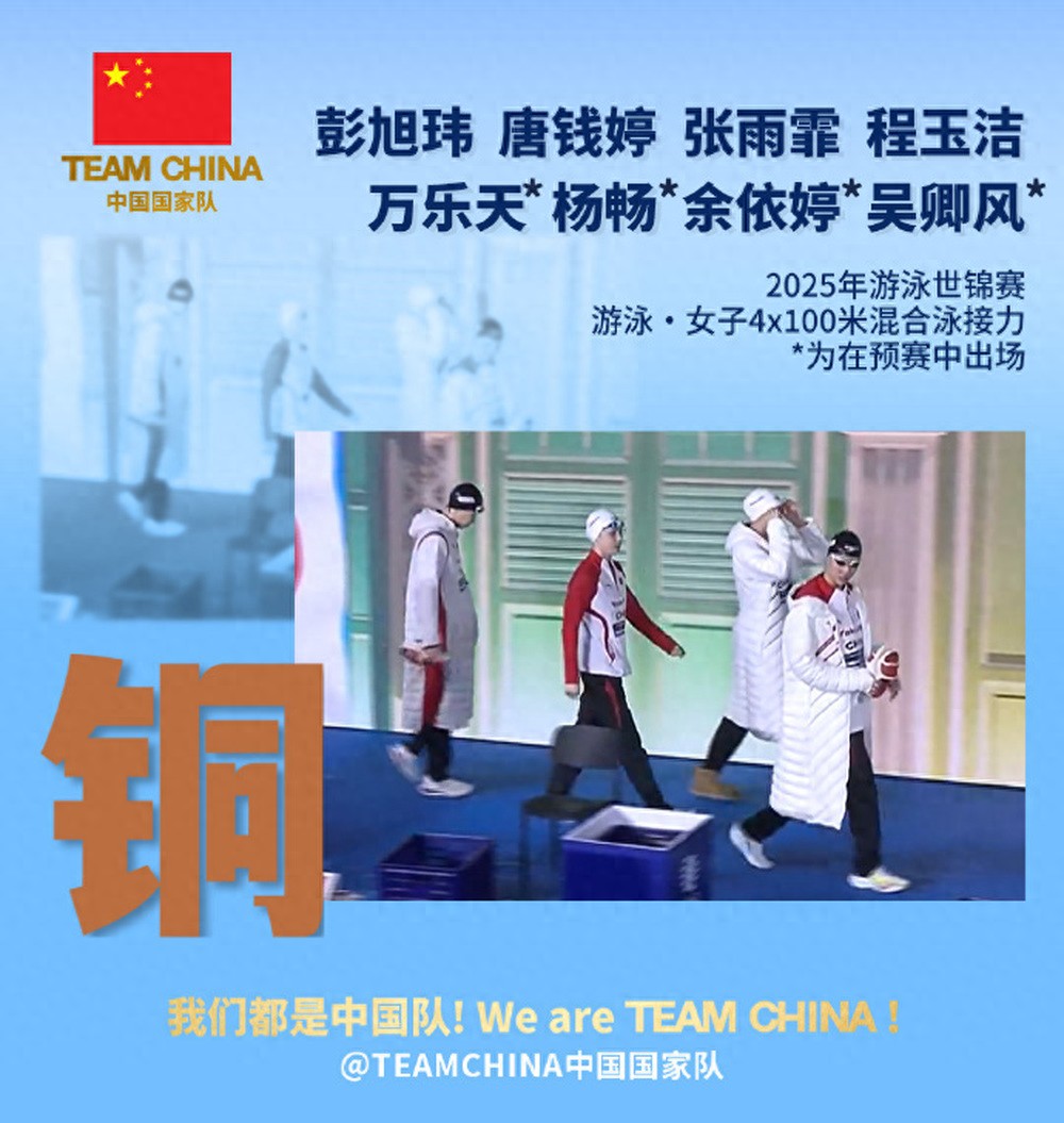 8月3日晚,2025年新加坡游泳世錦賽游泳項目女子4×100混合泳接力決賽結束,由彭旭瑋、唐錢婷、張雨霏、程玉潔組成的中國隊獲得銅牌,成績是3分54秒77。美國隊獲得冠軍并打破這個項目的世界紀錄,成績是3分49秒34。至此,本屆游泳世錦賽全部結束。