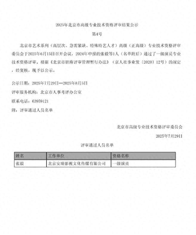 公示顯示,北京市藝術系列(高層次、急需緊缺、特殊特藝人才)高級(正高級)專業技術資格評審委員會于2025年6月15日召開會議,2024年申報的張毅等1人(名單附后)通過了一級演員專業技術資格評審。根據《北京市職稱評審管理暫行辦法》(京人社事業發(2020)12號)的規定,經復核,現予以公示。公示日期為2025年7月29日-2025年8月5日。