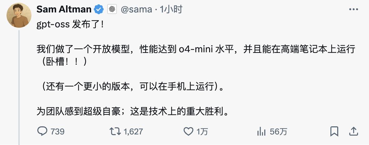 OpenAI CEO Sam Altman(山姆·奧特曼)在社交媒體上的興奮溢于言表:「gpt-oss 發布了!我們做了一個開放模型,性能達到o4-mini水平,并且能在高端筆記本上運行。為團隊感到超級自豪,這是技術上的重大勝利?!?/p>