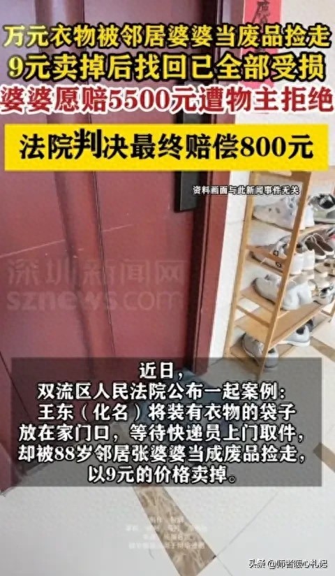 居民王東(化名)把價值一萬多元的品牌衣物放在家門口待寄,沒想到被88歲的鄰居張婆婆誤當(dāng)廢品撿走,以9元價格賣給了回收站。