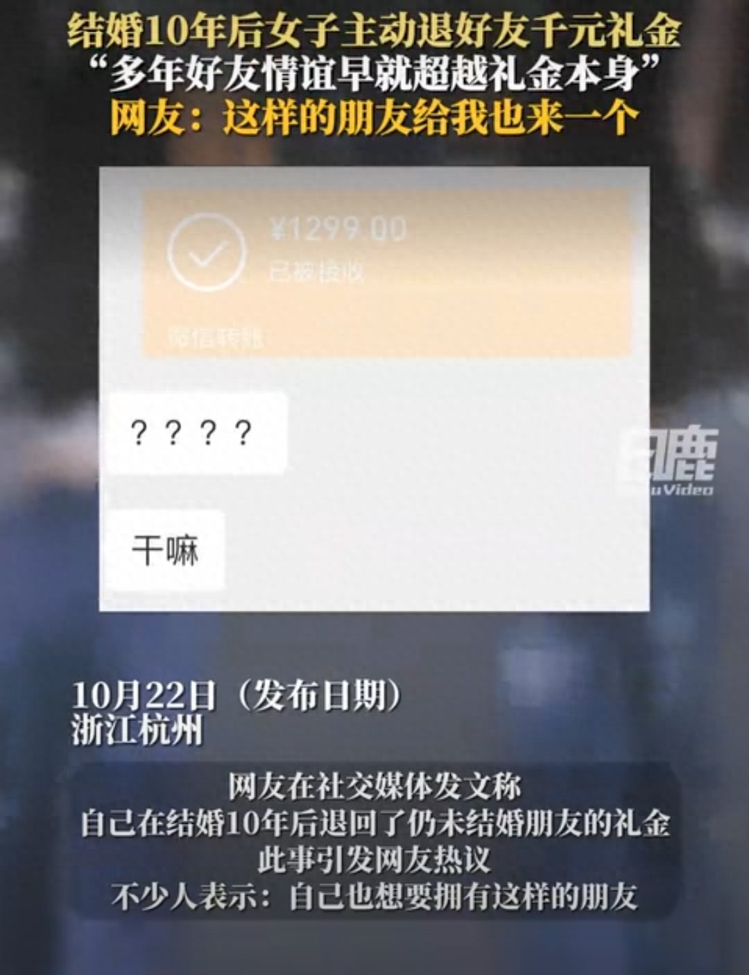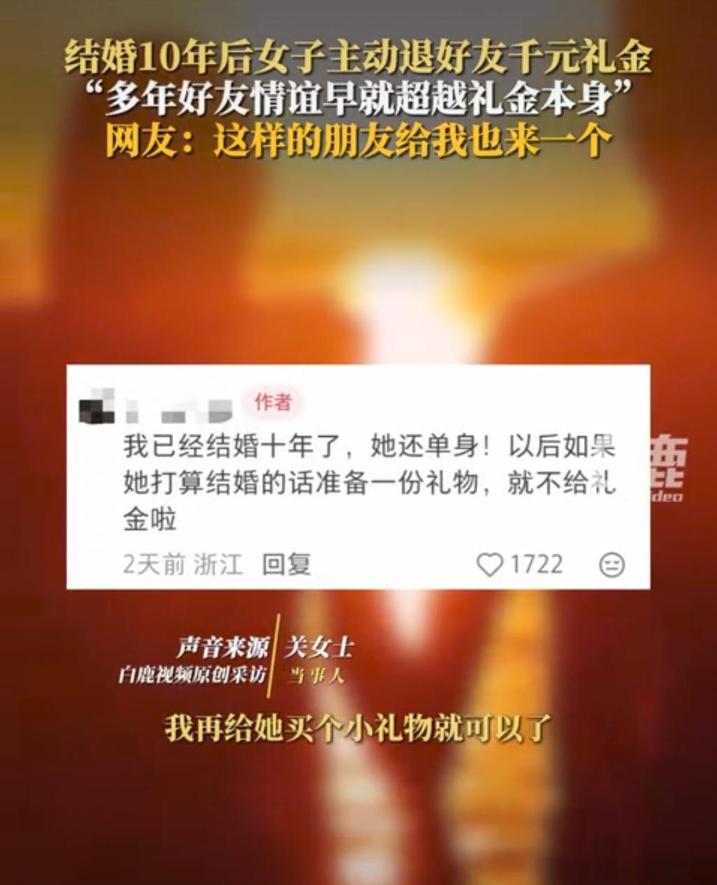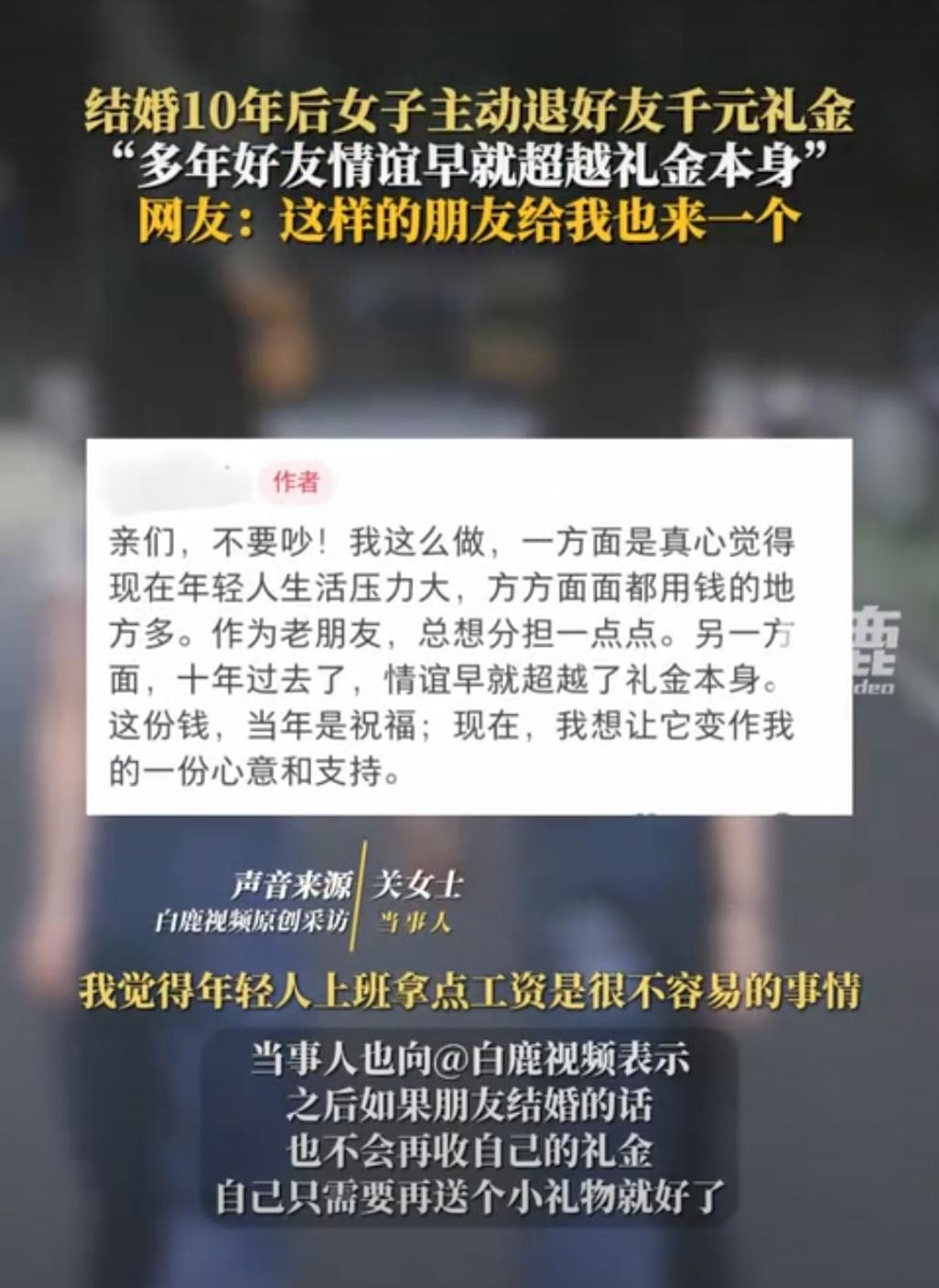 2025年10月24日傍晚6點(diǎn)22分,一段視頻把“人情往來(lái)”的話題炸上了熱搜——結(jié)婚十年的女子,主動(dòng)將當(dāng)年好友隨的千元禮金退了回去,只說(shuō)“這么多年的情誼,早不是錢(qián)能衡量的”。