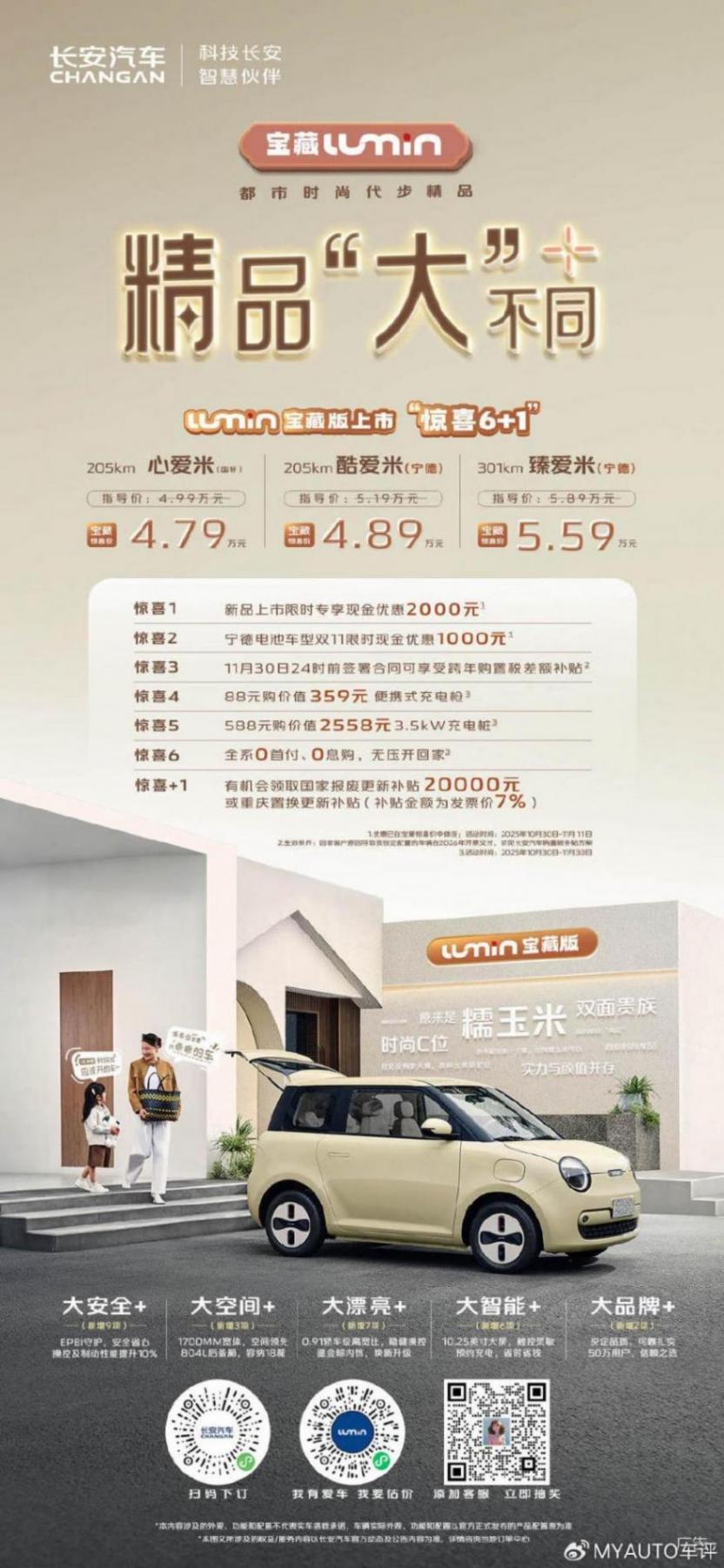 10月30日,都市時尚代步精品,Lumin寶藏版正式上市,共推出心愛米、酷愛米、臻愛米三個配置,官方驚喜價4.79萬-5.59萬。為回饋用戶,Lumin同步推出極具誠意的“驚喜6+1”大禮,購車門檻大幅降低。