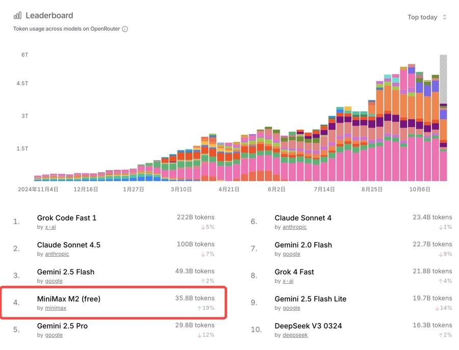 值得注意的是,文本模型M2上線僅5天,在API整合平臺OpenRouter上的實時調用token量已經排到了全球第四、國產第一,超過DeepSeek和Qwen;在編程場景中全球第三。M2在Coding,Agentic,Deep Research等場景顯著提升,作為第一個國產模型真正在復雜的Coding、Agent場景中進入硅谷主流視野,每天的調用量token仍在迅速增長。