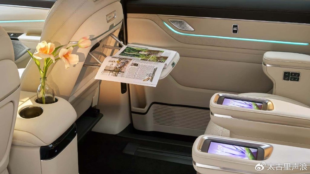車內(nèi),第一排座椅后方配置有小桌板;第二排為獨(dú)立座椅,坐墊寬大厚實(shí),并有可以調(diào)節(jié)的腿托,大概率為零重力座椅。并且中間扶手配有液晶屏,通常可以控制座椅、空調(diào)等。值得一提的是,全景天窗向后延伸到了第三排上方,提高了第三排乘客的視覺空間,減少壓抑感。