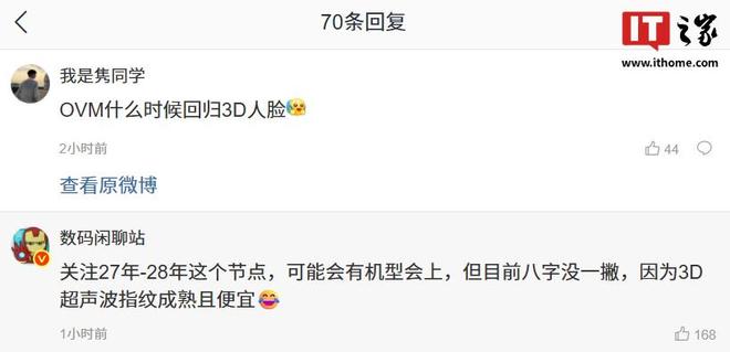 IT之家注意到,有用戶詢問 OVM(OPPO、vivo、小米)什么時候回歸 3D 人臉?博主表示:“關注 27 年-28 年這個節點,可能會有機型會上,但目前八字沒一撇,因為 3D 超聲波指紋成熟且便宜。”