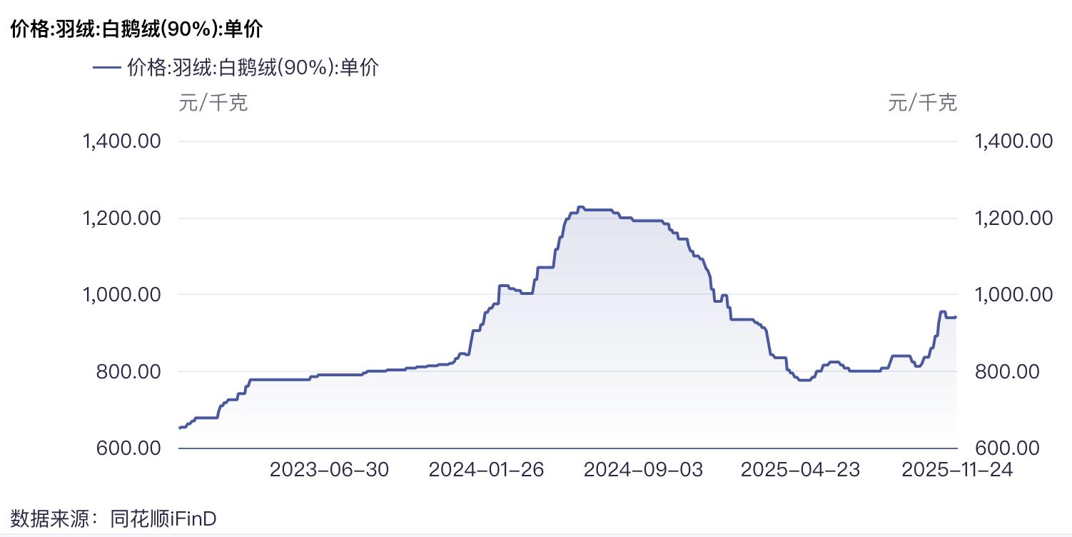 具體來看,原料方面,或受豬肉價格下跌影響,鴨肉、鵝肉需求減少,疊加養殖端行業產能調整,羽絨供應收縮,對羽絨價格形成支撐。其中尤其是鴨絨漲價更為明顯。