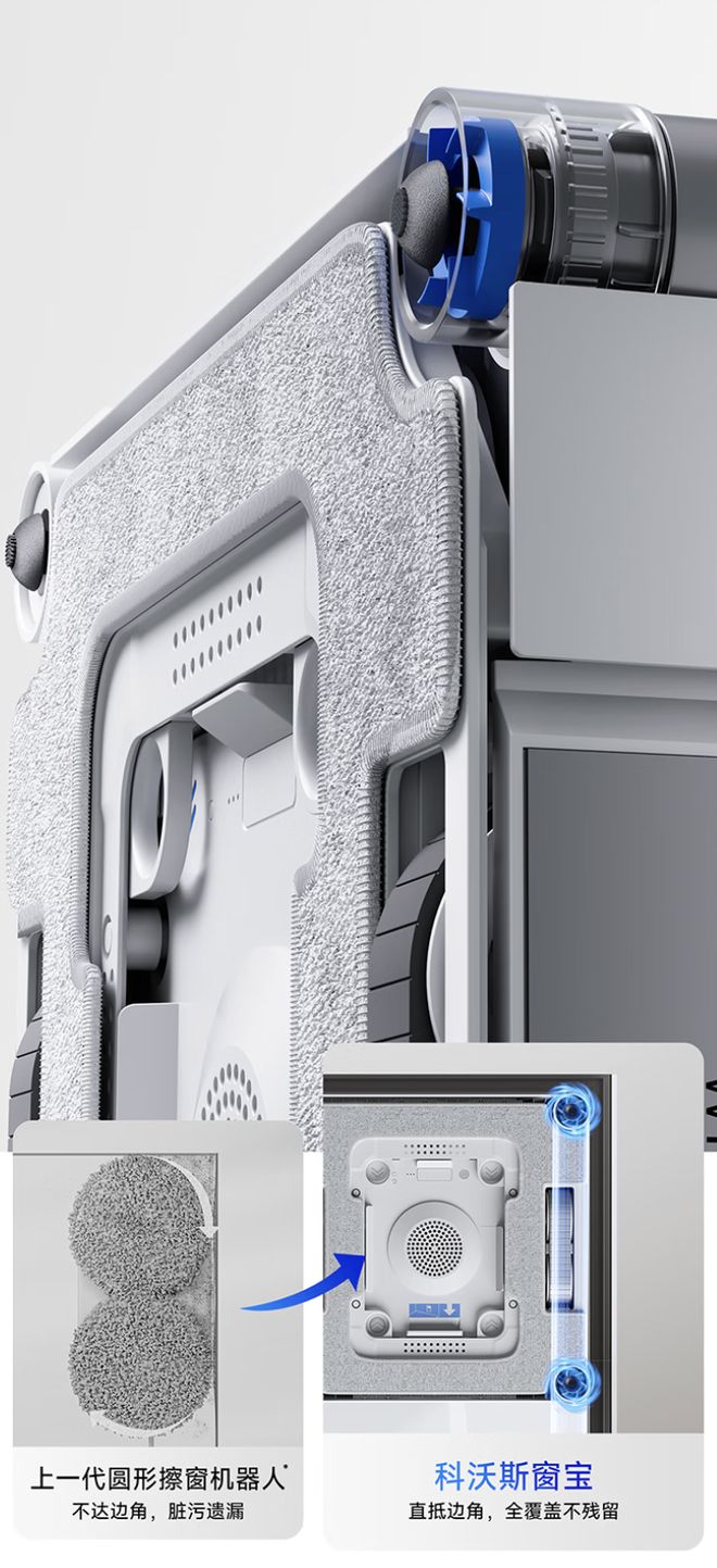 據介紹,該產品首次將地面清潔機器人的基站清洗邏輯引入立面場景,采用了雙向三噴頭設計,同時配備了 Vortex Wash 超旋勁洗系統,能夠模擬人手搓洗邏輯,有效剝離附著在抹布上的鳥糞、雨痕及灰塵等頑固污漬。