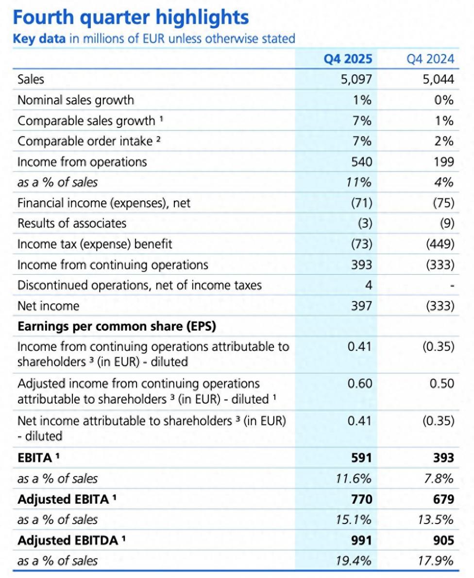 盈利方面,Q4調整后的息稅攤銷前利潤(EBITA)為7.70億歐元,好于分析師共識預期的6.72億歐元;調整后的EBITA利潤率為15.1%,較上年同期增加160個基點。這主要得益于銷售額增長、產品結構優化效應以及生產效率提升措施,盡管部分利潤被關稅成本上升所抵消。凈利潤為3.97億歐元,上年同期凈虧損3.33億歐元。