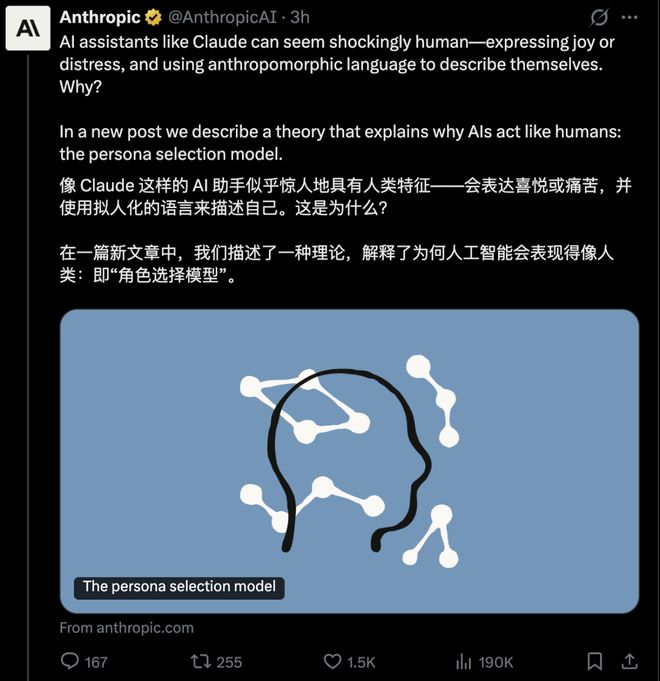 在Anthropic剛剛發布的「人格選擇模型(PSM,The persona selection model):為什么AI助手可能表現得像人類」一文中,詳細解釋了AI「類人」行為背后的真相。